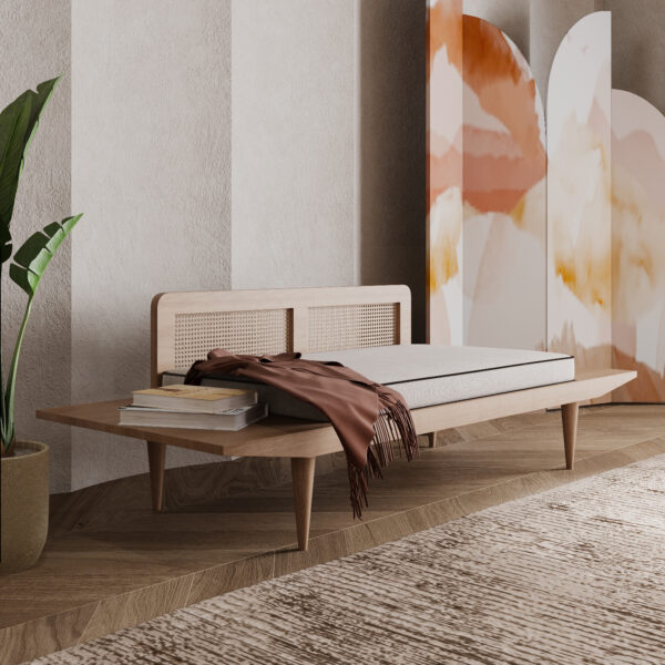 Inspirée des années 50 avec son look élégant et simple, la banquette Jan sera un élément indispensable de votre intérieur. Des tablettes se trouvent de part et d’autre de cette banquette fait en placage de chêne, avec un vernis de coloris naturel ainsi qu’un dossier en cannage tressé. Veuillez nous contacter pour vos dimensions spéciales.