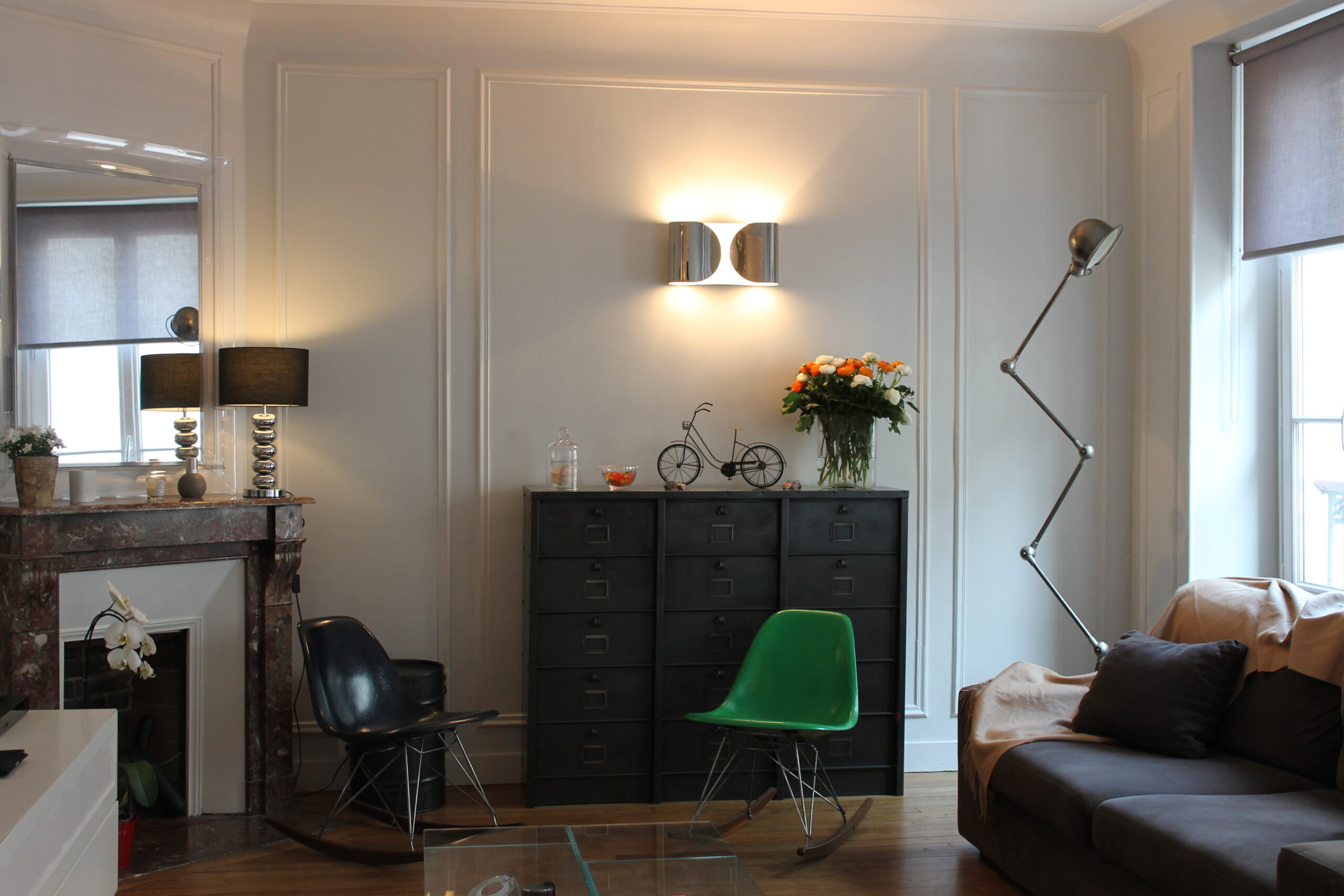 Situé dans le 17eme arrondissement de Paris, cet appartement de 2 pièces bénéficie d’un environnement spacieux et lumineux. Le mur de la salle à manger a été peint en coloris « orange Hermès » et est ainsi devenu le fil conducteur et la couleur dominante du salon et de la salle à manger. Également dans la chambre, cette touche d’orange a été reprise avec les appliques murales de la marque « Jielde ».